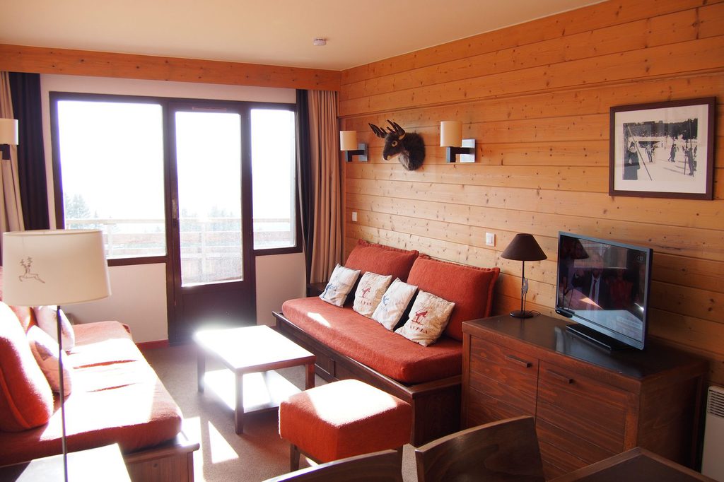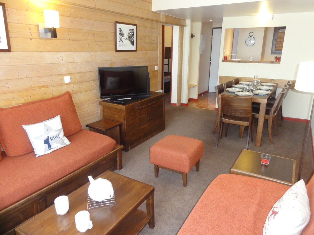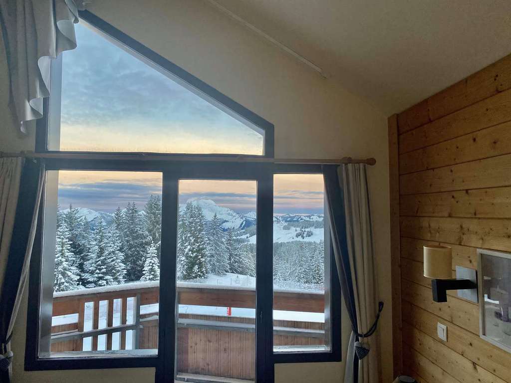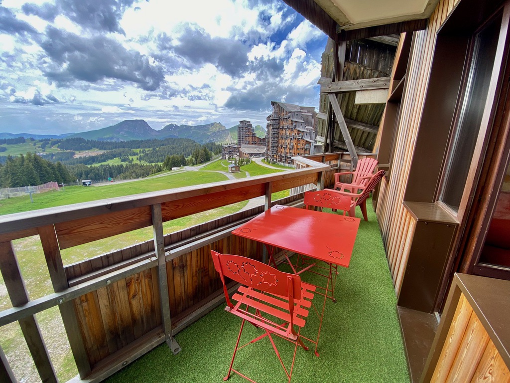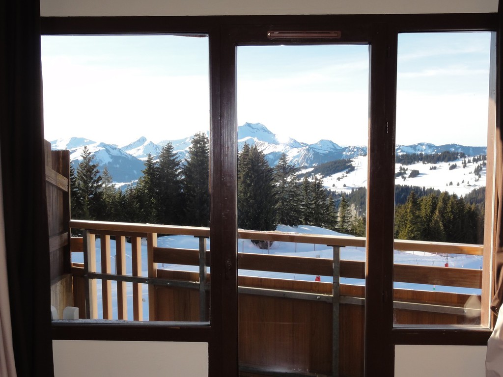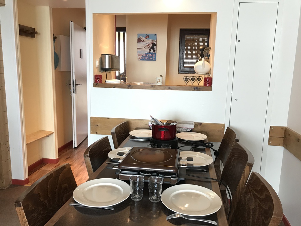 Coin repas avec table et chaises pour tout le confort nécessaire, écran TV séjour, wifi sécurisé, grand balcon plein sud avec vue dégagée sur les montagnes environnantes sans