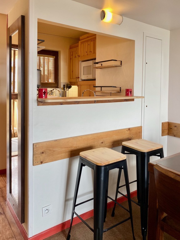 une cuisine toute équipée et conviviale grâce au passe-plat ouvert sur l'espace